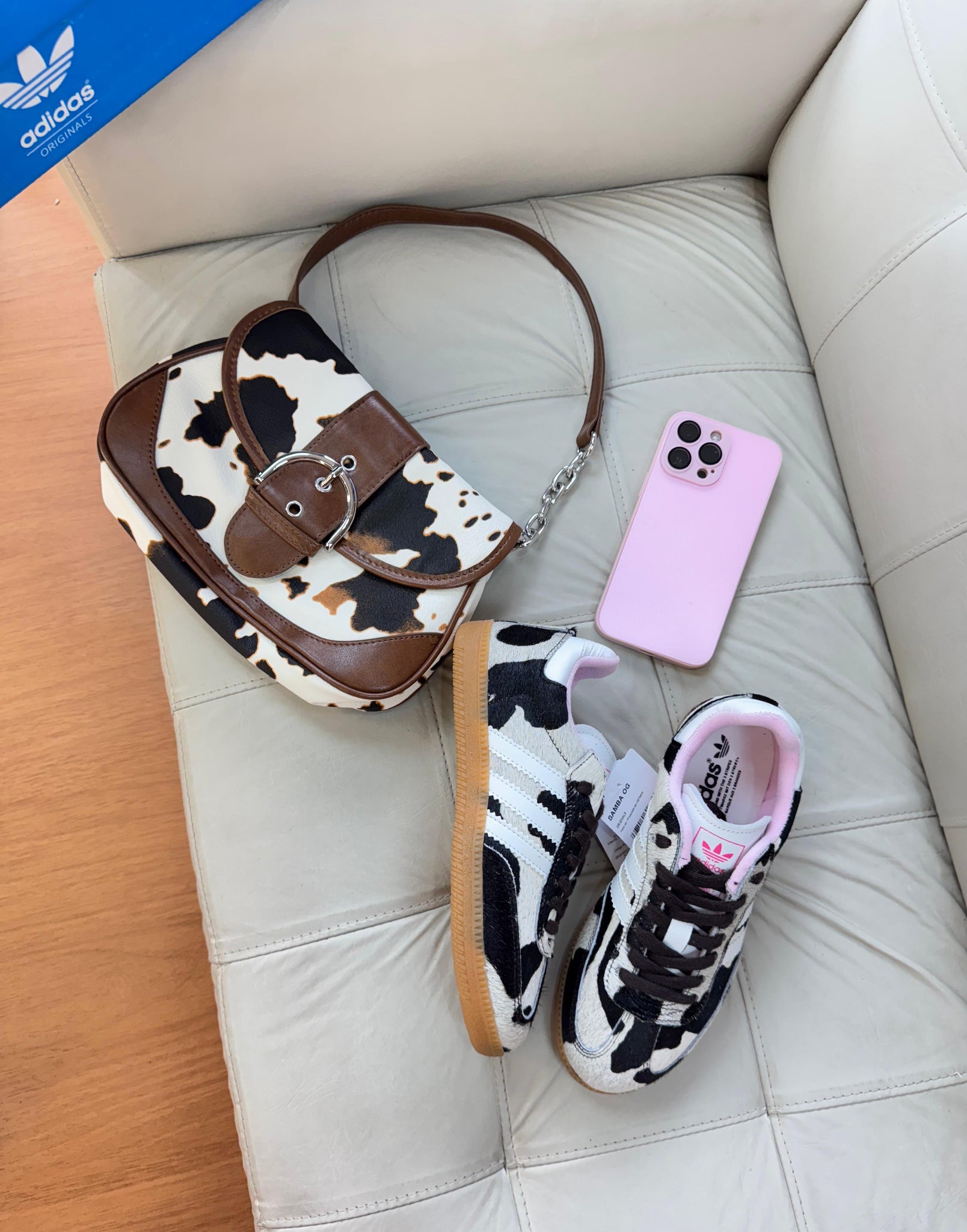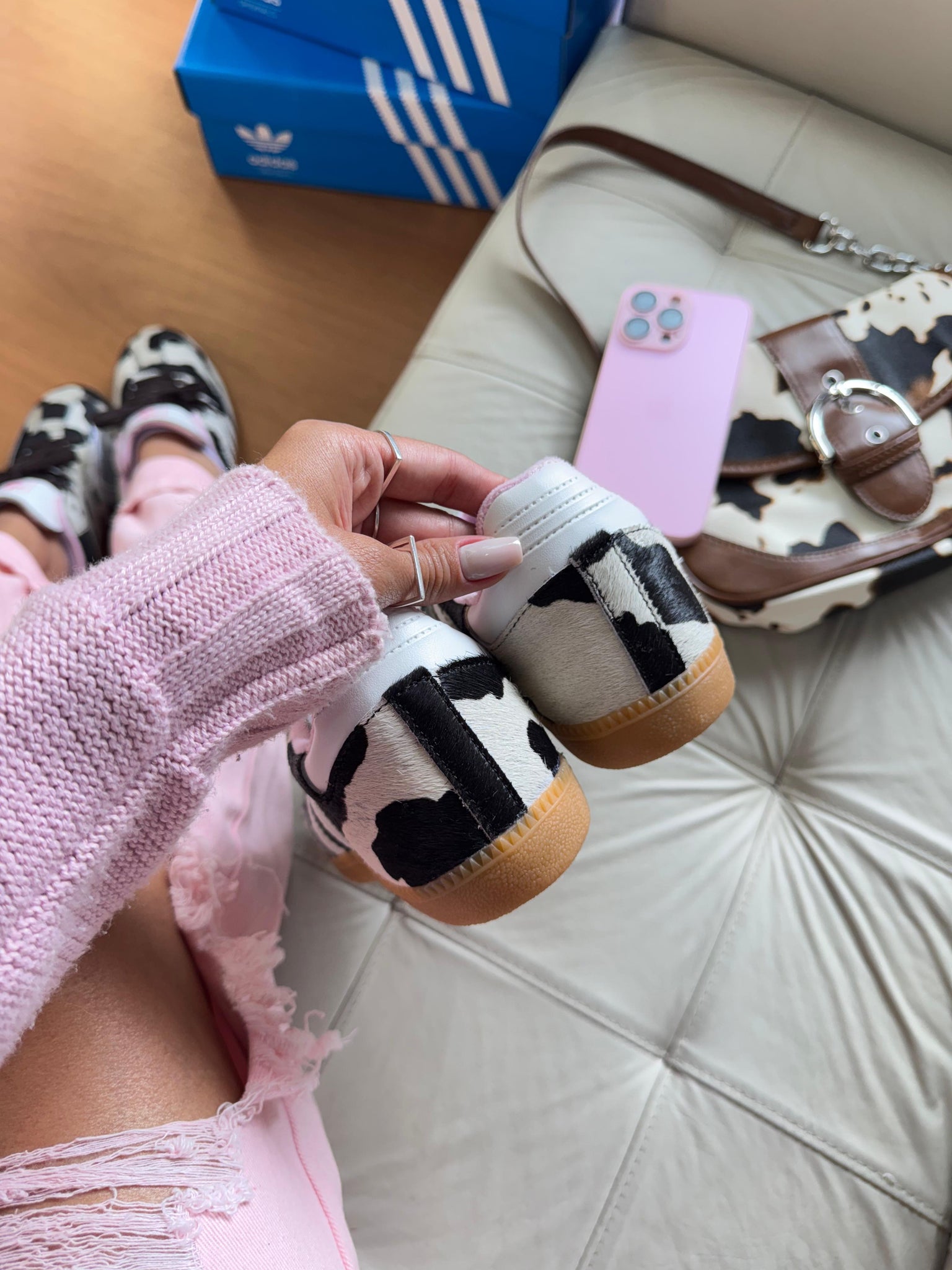 O cabedal de couro texturizado típico do adidas Original é coberto com pele falsa com estampa de vaca selvagem. As 3 listras do perfil, as línguas e os painéis do calcanhar de Aquiles mantêm as coisas simples em couro 'Off-White'. O forro interno não participa da transformação peluda. Em vez disso, ele também opta por uma construção de couro macio que introduz um rosa claro na mistura. Sob os pés, o Samba feminino completa a versão experimental com uma unidade de sola marrom 'Gum' que permite que a metade superior se deleite sob os holofotes.