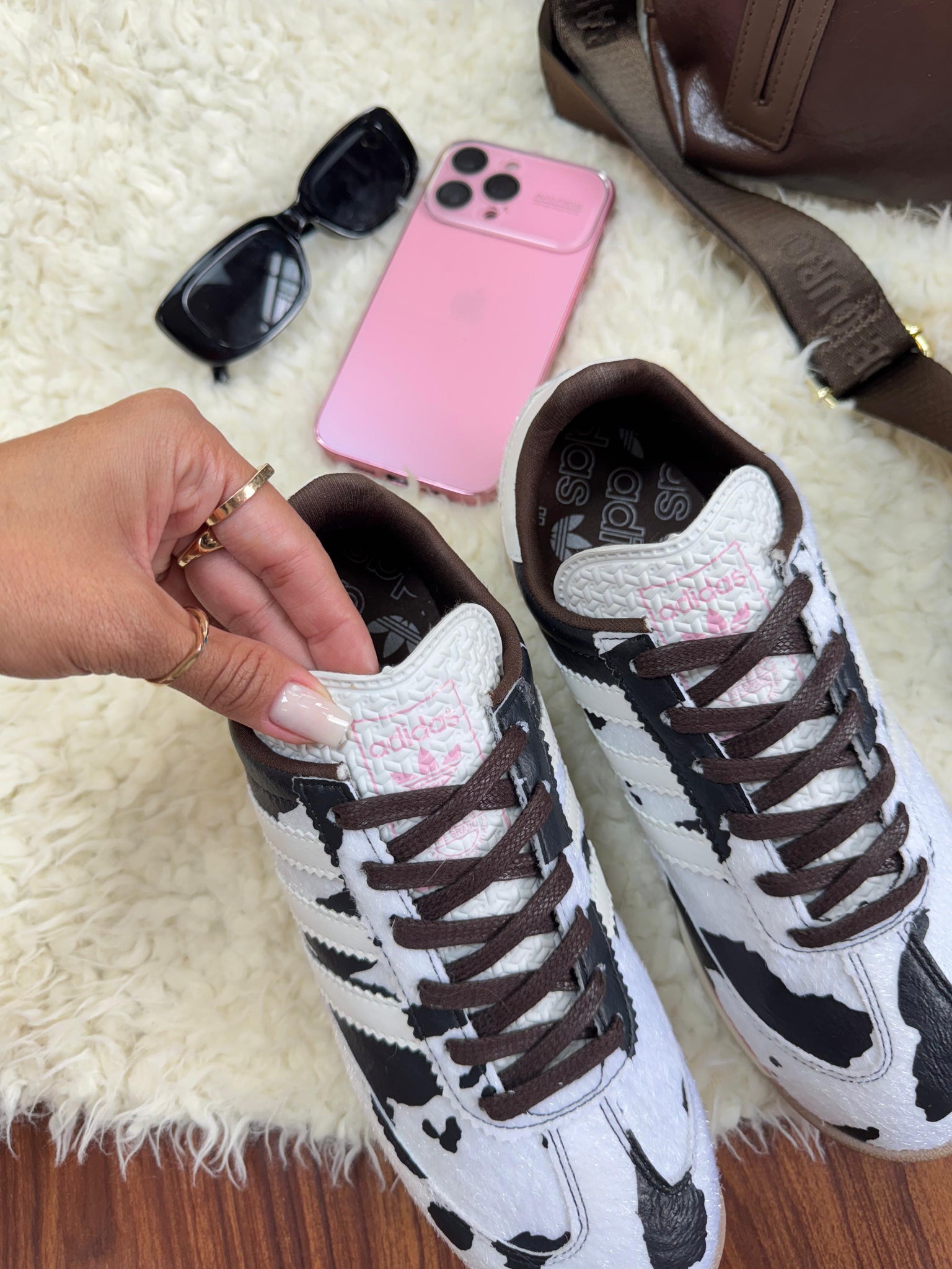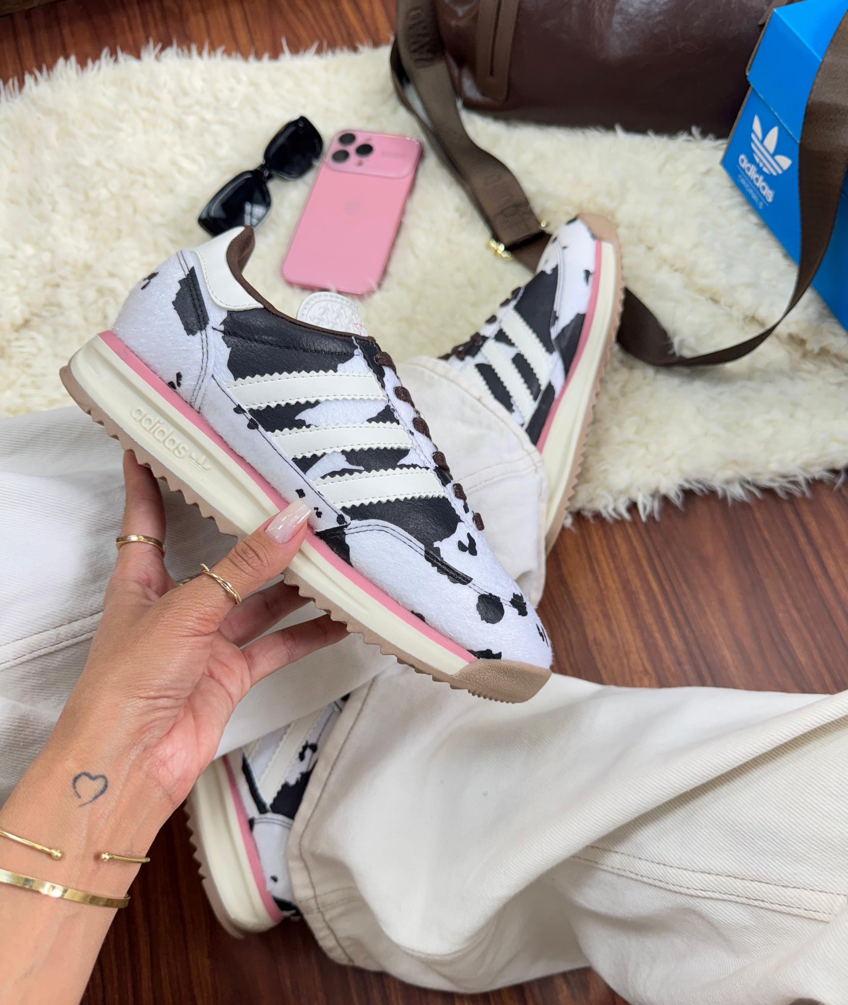 O Adidas SL 72 OG "Cow Print" é mais uma das colorways do clássico runner das três listras, aproveitando a tendência da estampa animal print que tem se destacado nos últimos meses. Com um cabedal revestido em pelo sintético que simula a padronagem de vaca, o modelo se destaca pelo contraste único e visual marcante.
