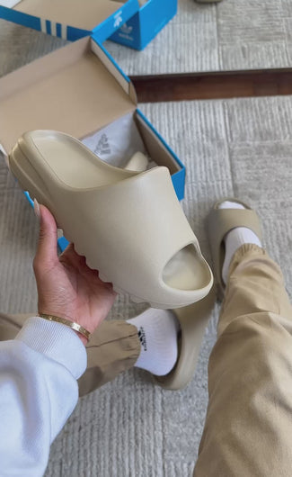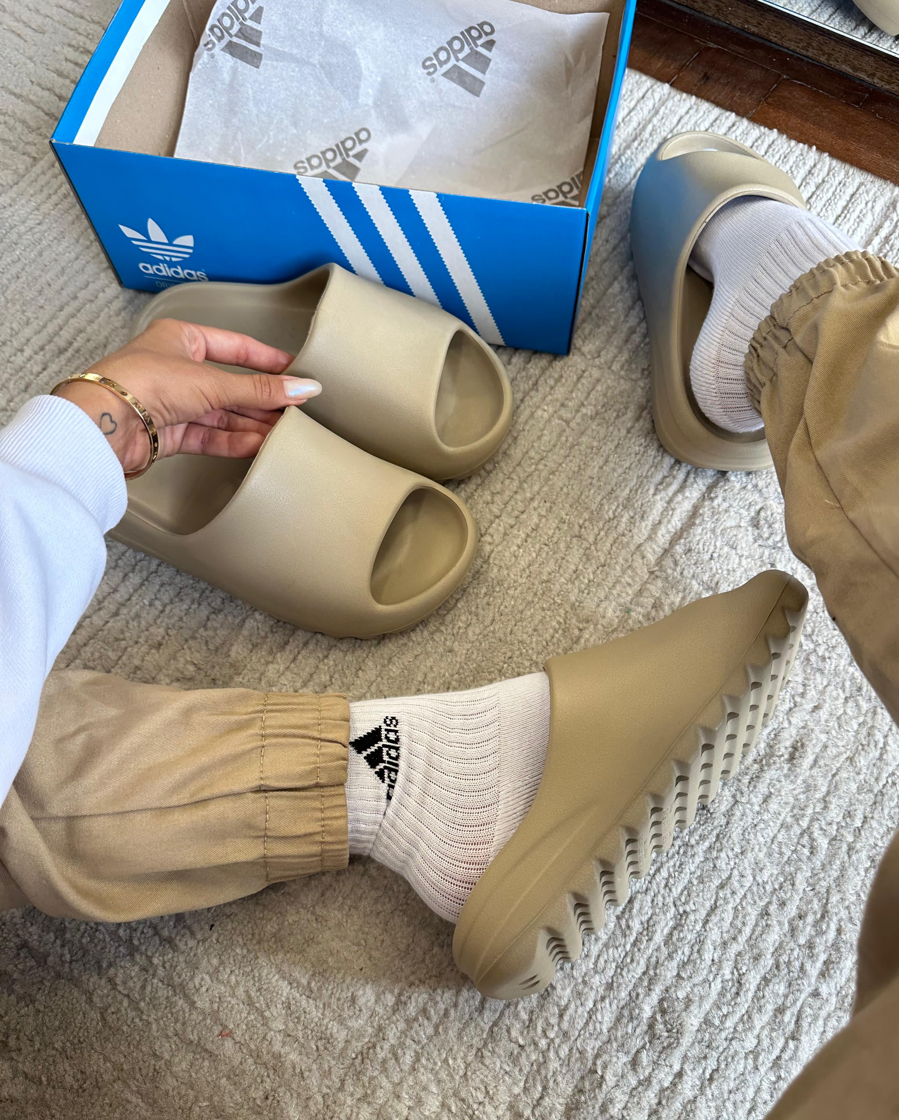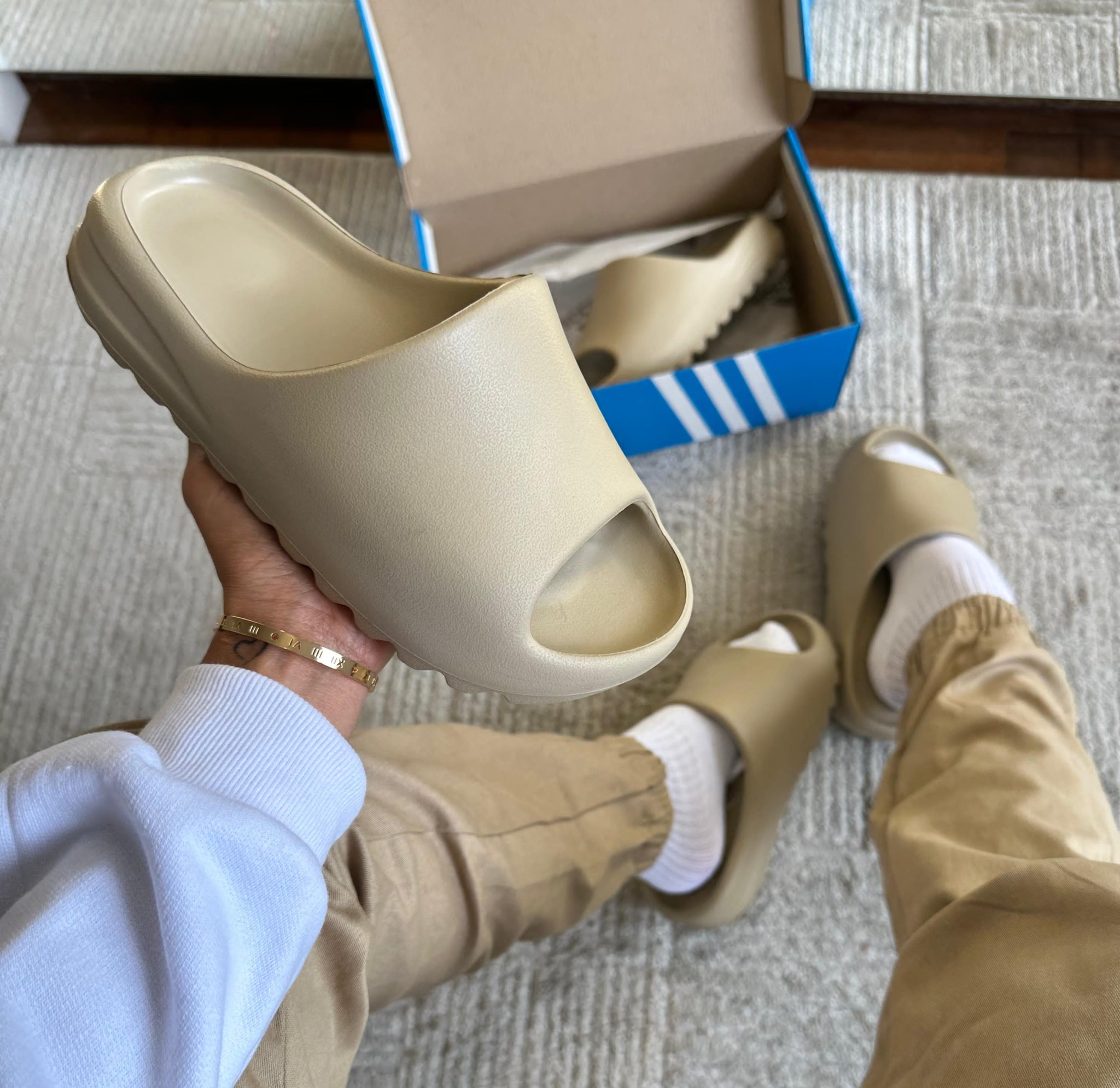 A Adidas Yeezy Slide Core é feita de uma base marrom claro com uma abertura na metade do par, bem como na frente.