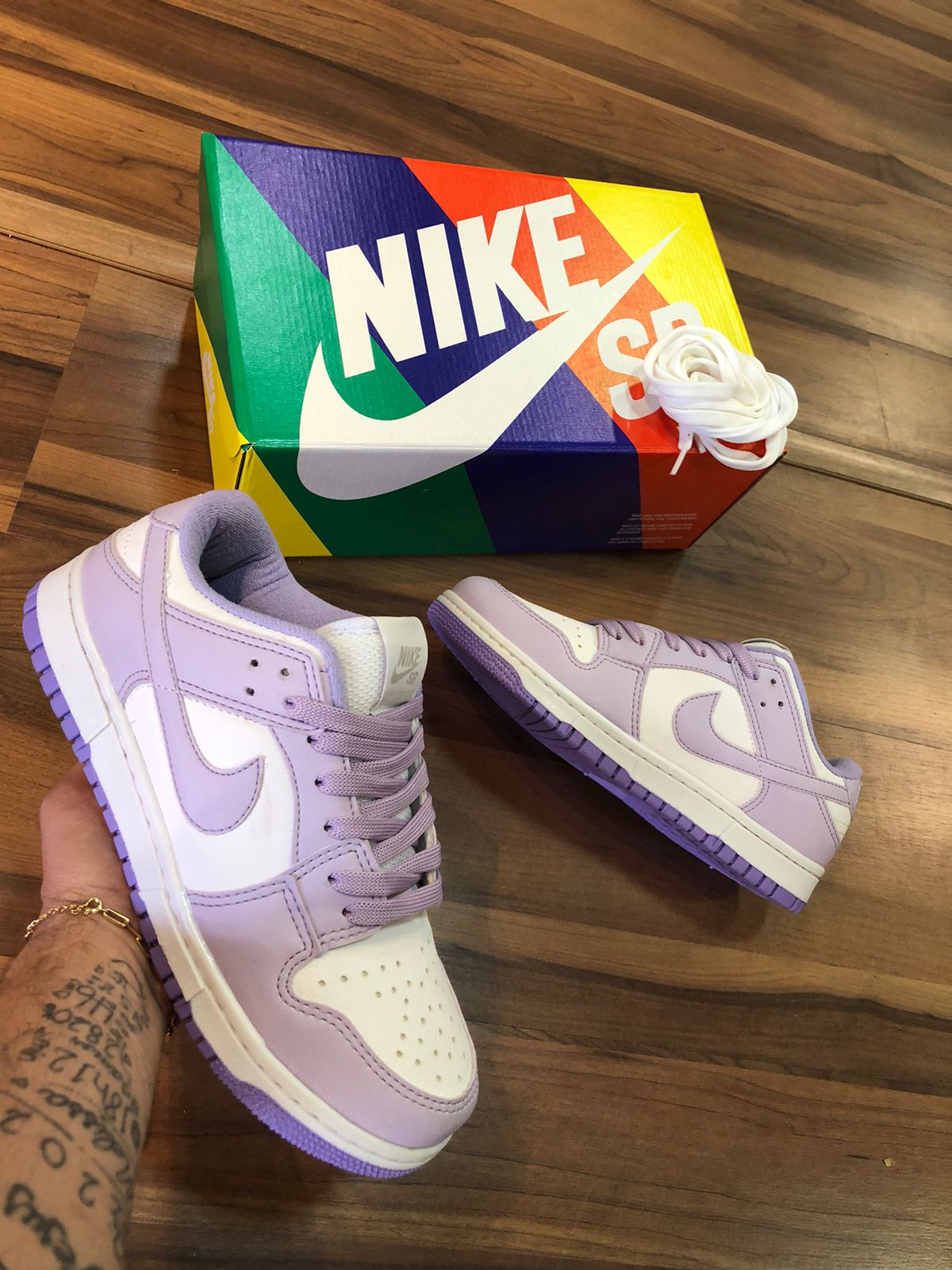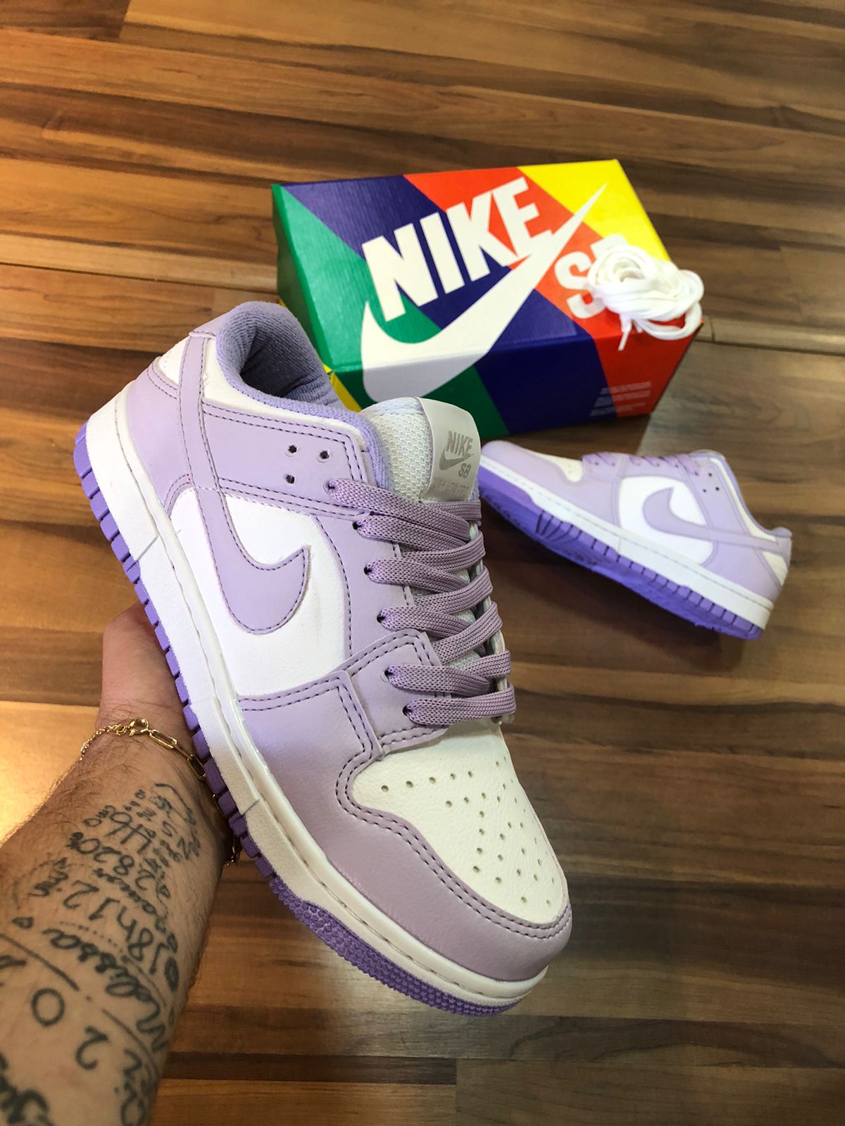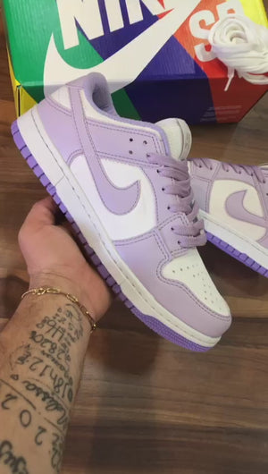 O Nike Dunk Low Lilac apresenta uma parte superior de couro branco com sobreposições e Swooshes em um leve tom roxo.