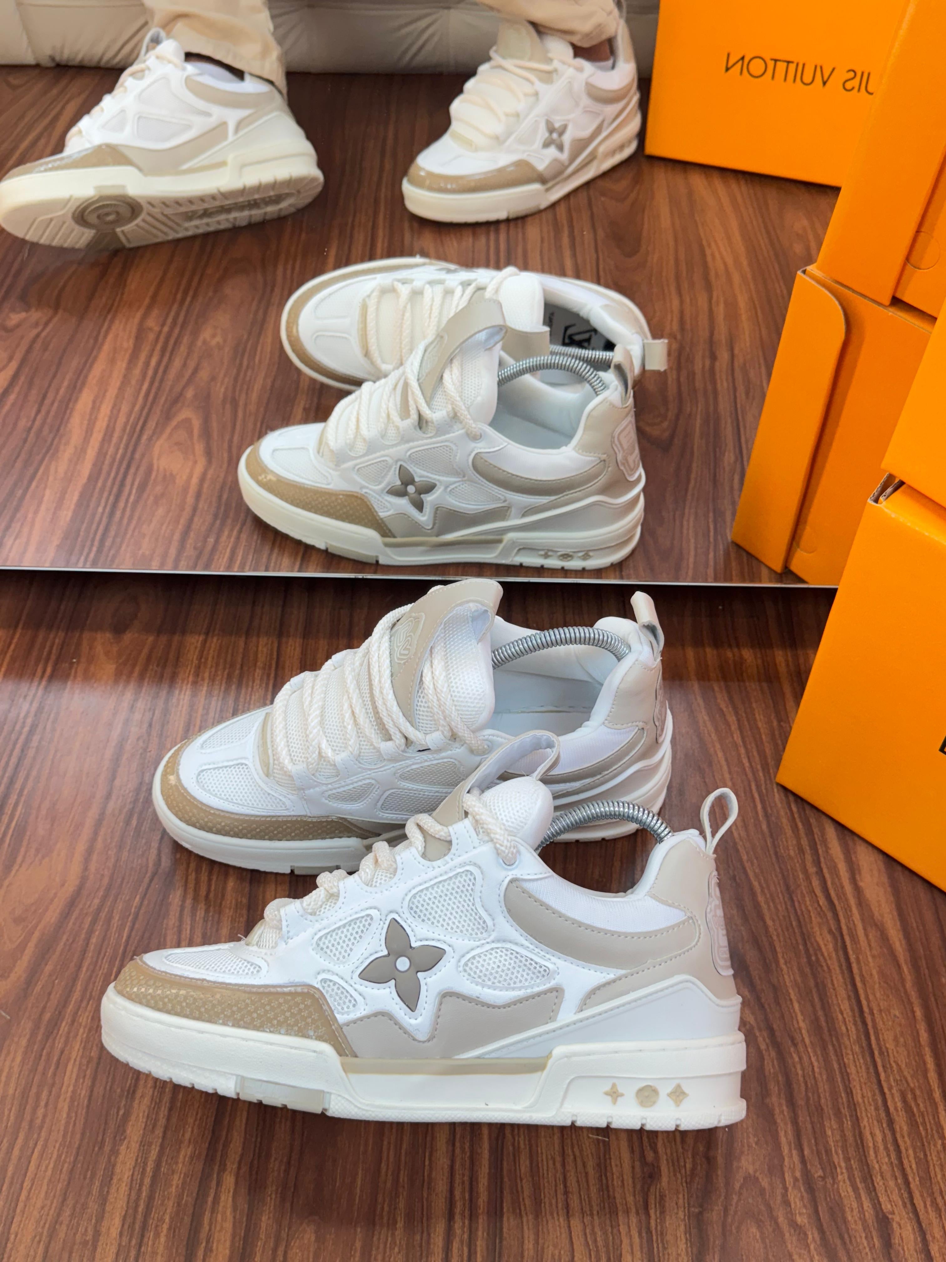 O tênis LV Skate é revisitado nesta estação em um mix de materiais, incluindo malha tecnológica. O design remete aos tênis de skate dos anos 90, trazendo um forro em tecido tecnológico estampado com o Monogram e acolchoamento extra, para o máximo de conforto. Este modelo bicolor apresenta uma Flor do Monogram na lateral e três no solado.
